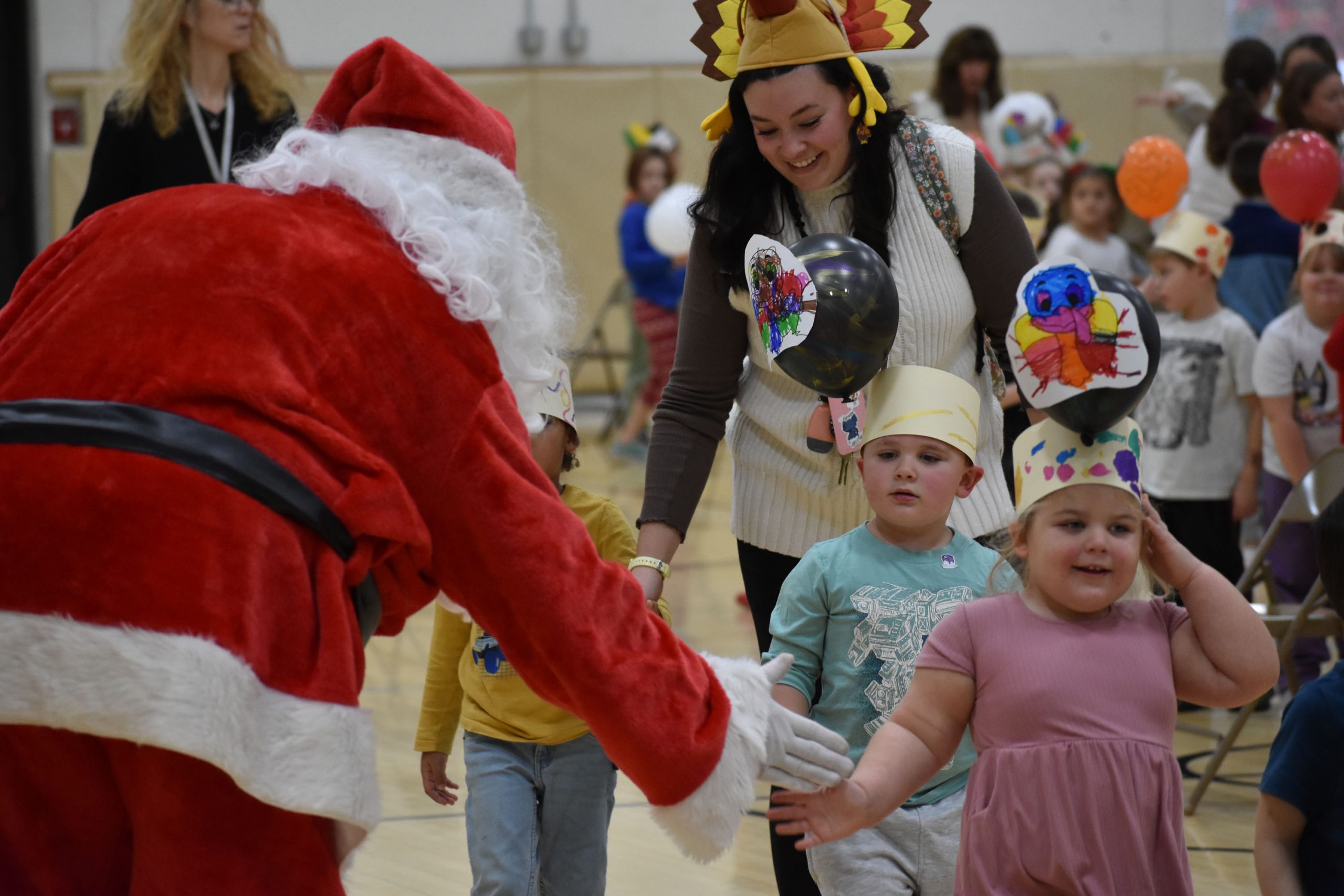 The event featured students parading with balloons they made, musical performances, teachers putting on a show in a kickline, turkey dancing, Santa Claus and more!
